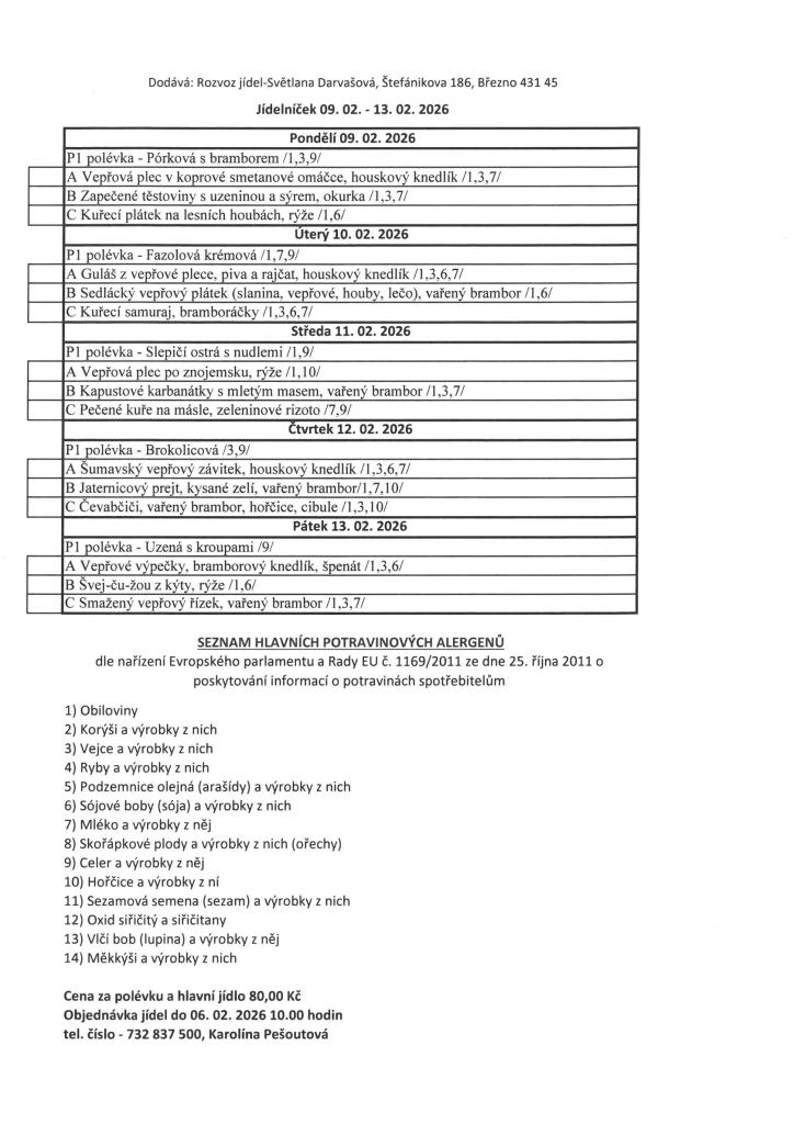 Cena za polévku a hlavní jídlo je 80,- Kč. V případě zájmu objednaní obědů občanů Lužic a Svinčic, volejte do 6. 2. 2026 do 10hod. na tel. č.: 732 837 500 Pešoutová.